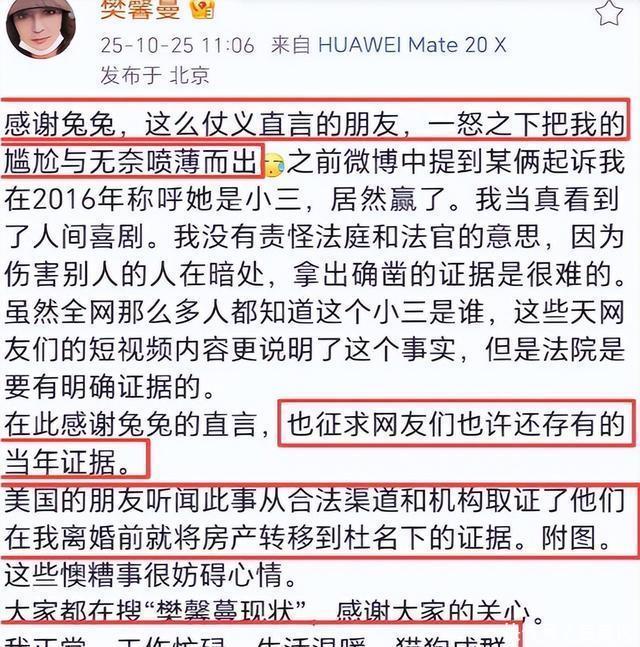 真是奇了怪了,一个“三姐”上位还敢招摇撞市,甚至还倒反天罡将原配告上法庭胜诉了, 别说樊馨蔓气的很,连网友们都替她委屈着急,甚至发视频替她打抱不平,“怨”她脾气太好才被老张欺负那么狠。